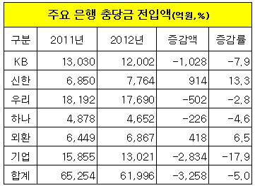 금융지주와 달리 은행들은 지난해 대손충당금 적립액이 6조2천억원으로 2011년 6조5천254억원 보다 소폭 감소했다. 이는 올해부터 도입할 계획이었던 국제 은행의 자산기준(바젤3)에 발맞춰 평소보다 2011년 대손충당금을 더 쌓았기 때문이다.