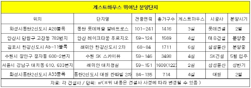 이 밖에도 대우건설이 경기 안산 고잔동에 분양중인 ‘레이크타운 푸르지오’와 삼성물산이 경기 김포 한강신도시에 분양중인 ‘래미안 한강신도시 2차’도 각각 4실과 6실의 게스트하우스를 마련, 5.4m의 높은 층고를 이용한 개방감이 뛰어난 공간을 선보일 예정이다.