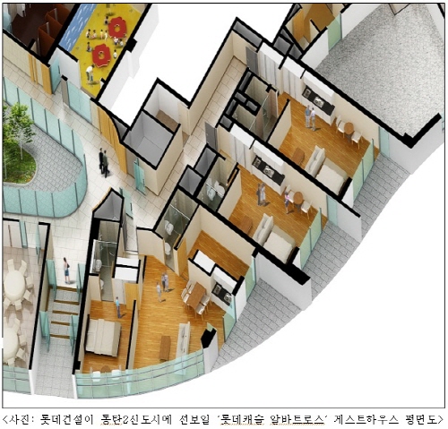 우선 올해 분양단지 중 가장 뜨거운 감자인 동타2신도시에 롯데건설이 분양을 준비 중인 ‘동탄 롯데캐슬 알바트로스’다. 이곳은 커뮤니티 시설 안에 총 3실의 게스트하우스가 설치된다. 무엇보다 3실 모두 취사가 가능한 콘도형으로 건립되는 것이 특장점이다.