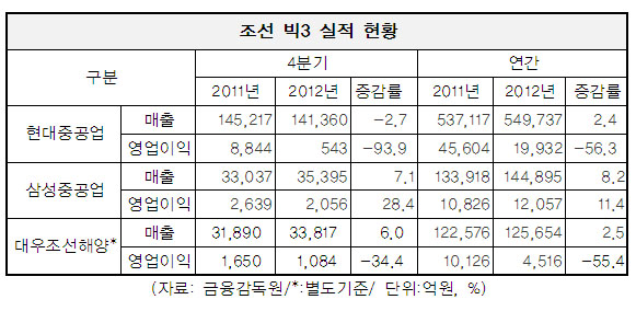 지난해 빅3중 유일하게 수주 목표를 초과달성한 대우조선해양은 지난해 매출 12조5천654억 원을 기록해 2.5% 늘어났지만, 영업이익은 4천516억 원으로 55.4%나 급감했다. 지난해 4분기 역시 매출은 3조3천817억 원으로 전년 동기 대비 6.0% 늘었지만, 영업이익은 1천84억 원으로 34.4% 감소했다.