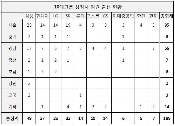 삼성그룹은 전체 임원 49명 중 46.9%를 차지하는 23명이 서울 출신으로 가장 많았고 다음으로 영남 출신이 17명(34.7%)으로 나타났다.