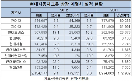계열사별로 보면, 대표 계열사인 현대차는 매출이 84조5천억 원으로 전년 77조8천억원에 비해 8.6%가 늘었다. 영업이익은 8조에서 8조4천400억 원으로 5% 가량 증가했다.
