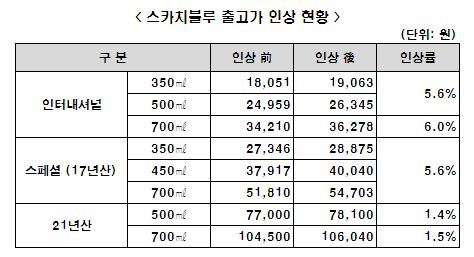 인상 품목은 스카치블루 인터내셔널, 스페셜(17년산), 21년산 등 3개 제품이다. 이번 출고가 인상으로 주력 제품 스카치블루 인터내셔널의 500㎖ 제품 출고가는 2만4천959원에서 2만6천345원으로 5.6% 인상되고, 스페셜(17년산) 450㎖ 제품 역시 5.6% 인상돼 출고가가 3만7천917에서 4만40원으로 변경된다. 최고급 제품인 21년산은 500㎖ 기준으로 출고가가 7만7천원에서 7만8천100원으로 1.4% 인상된다.