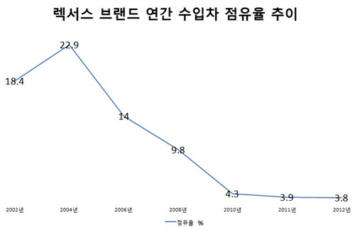 프리미엄 수입차 이미지를 앞세운 렉서스는 2001년 한국시장에 론칭한 뒤 5년 간 20%에 육박하는 점유율 행진을 이어가며 돌풍을 일으켰다. 하지만 수입차 시장이 날로 커지면서 BMW, 메르세데스 벤츠, 아우디 등 독일 브랜드에 시장을 내주며 점유율이 점차 바닥으로 떨어지기 시작했다.