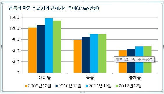 또 교육열이 강남 못지않은 서울 양천구 목동과 노원구 중계동도 사정이 별반 다르지 않았다. 지난해 목동은 2011년과 마찬가지로 3.3㎡당 1천100만 원 선을 유지했고, 중계동은 3.3㎡당 평균 750만원으로 소폭 상승한 것으로 드러났다.