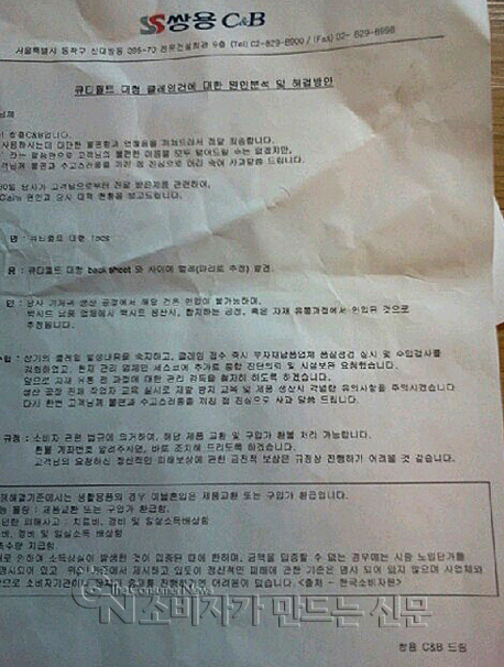 당시 이물 발견 후 2개월동안 회신이 없었던 쌍용제지 측은 소비자가 만드는 신문 취재 이후 "이물질이 발견된 기저귀를 확인한 후 환불과 함께 다른 기저귀로 보상 하겠다"고 약속했었다.