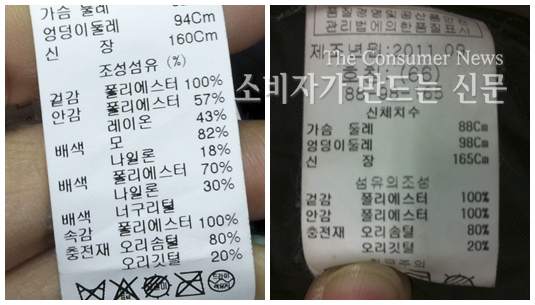 양 씨는 "다른 패딩들 케어라벨을 이것 저것 찾아봤는데 안감, 겉감에 대한 표기는 있어도 속감은 찾아볼 수 없어 뭐가 뭔지 모르겠다"며 상설 매장에서 파는 제품이라 눈속임을 하는 게 아닌지 의혹을 제기했다.
