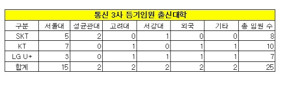 20일 통신업계에 따르면, 국내 통신 3사의 등기임원 25명 중 60%인 15명이 서울대 출신이다. 고려대와 성균관대, 서강대를 제외하면 임원 2명 이상을 배출한 대학은 한 군데도 없다.