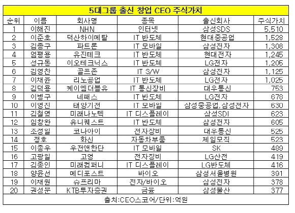 21일 CEO스코어(대표 박주근)가 5대 그룹 출신 창업 CEO 118명의 주식가치를 조사한 결과 NHN의 이해진 이사회 의장이 1위를 차지했다.