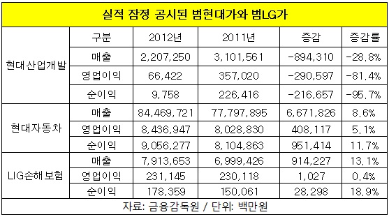 이런 가운데 지금까지 실적을 공시한 이들 기업 중 정의선 부회장과 구자준 회장이 이끄는 현대자동차와 LIG손해보험의 실적(매출, 영업이익, 순이익)이 대거 늘어난 반면, 현대산업개발은 큰 폭으로 쪼그라든 것으로 나타났다. 현대산업개발의 사업부문은 크게 주택과 토목으로 나뉘고, 이중 주택산업 분야 의존도가 60%에 달한다. 그런데 국내 부동산 시장 침체가 계속되고 있어 직격탄을 맞은 것이다.
