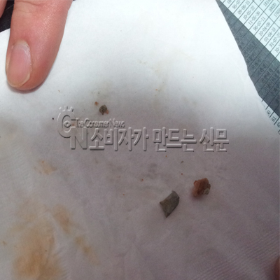 깜짝 놀란 지 씨. 다급하게 입안에 있는 음식물을 뱉어보니 이물의 정체는 다름아닌 0.5cm정도의 콘크리트 조각이었다. 단단한 이물질을 씹는 바람에 치아에 엄청난 통증을 느꼈다고.