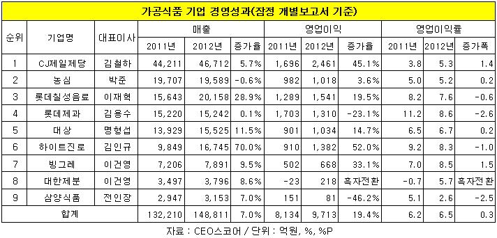 21일 재벌 및 CEO, 기업경영성과 평가 사이트인 CEO스코어(대표 박주근)에 따르면 지난해 하반기와 올초 가공식품가격을 인상한 CJ제일제당 등 식품업체 9곳의 지난해 총 매출은 13조2천210억원, 영업이익은 9천713억원으로 전년에 비해 각각 7%, 19.4% 증가했다.