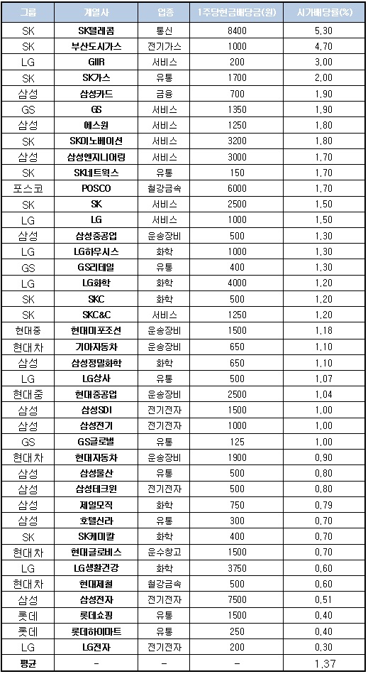 이어 SK가스(사장 정헌), 삼성카드(사장 최치훈), GS(회장 허창수), 에스원(사장 윤진혁), SK이노베이션(부회장 구자영), 삼성엔지니어링(사장 박기석), SK네트웍스(사장 문덕규), 포스코(회장 정준양), SK(회장 최태원), LG(회장 구본무) 등은 은행 금리에는 미치지 못하나 평균보다는 높은 1.5~2%의 시가배당률을 기록했다.