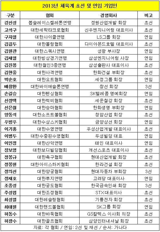 연임 중에선 구자열 대한사이클연맹 회장(LS그룹 회장)과 조양호 대한탁구협회장(한진그룹 회장), 최태원 대한핸드볼협회장(SK그룹 회장), 손길승 대한펜싱협회 회장(SK텔레콤 명예회장)이 눈에 띈다.