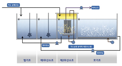동부건설의 4단계 하폐수 고도처리 기술은 기존 MBR (Membrane Bio-Reactor) 공법에서 호기조에 침지됐던 분리막(멤브레인)을 제2무산소조로 옮겨와 설치하는 기술이 국내 최초로 도입된 것이 가장 큰 특징이다.