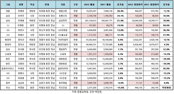 이 외에 정몽구 회장의 장남 정의선 부회장의 현대자동차그룹, 이건희 회장 차녀 이서현 부사장의 제일모직, 이명희 회장 장남 정용진 부회장의 신세계, 조양래 회장 장남과 장녀인 조원태·현아 부사장의 대한항공, 박삼구 회장 장남 박세창 부사장의 금호타이어, 허창수 회장 동생과 장남인 허명수 사장과 허윤홍 상무의 GS건설 등이 플러스 성장을 달성했다.