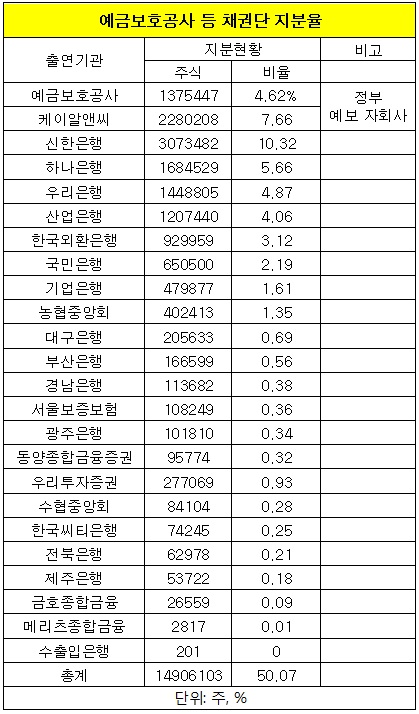 이런 가운데 금융위원회는 캠코가 반납한 쌍용건설 지분 38.75%를 출자 비율에 따라 예금보호공사(예보)와 산하 케이알앤씨, 신한은행 등 23개 채권은행에 배분토록 했다. 이에 따라 예보와 산하 케이알앤씨가 각각 4.62%와 7.66%를 보유하게 돼 12.28%로 사실상 최대주주가 된다. 이어 신한은행(10.32%)과 하나은행(5.66%), 우리은행(4.87%), KDB산업은행(4.06%), 한국외환은행(3.12%), 국민은행(2.19%) 등 23개 금융사가 보유한 지분까지 합치게 되면 지분율이 50.07%에 이른다.