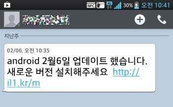 서울시 강동구 고덕동에 사는 양(남)씨는 역시 지난 6일 휴대폰으로 ‘안드로이드 새로운 버전이 나왔으니 업데이트 하라’는 문자를 받아 URL 주소를 터치했다.