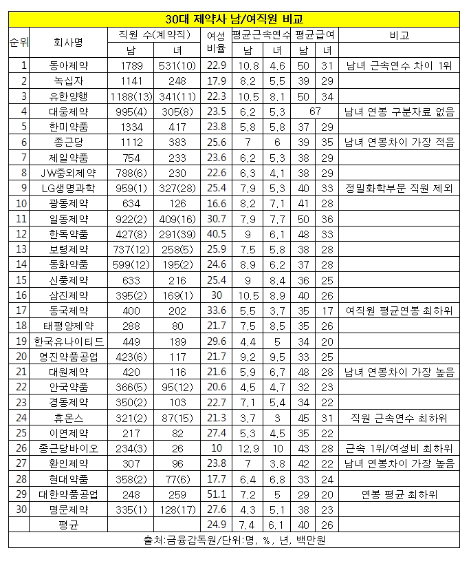 남녀 직원의 연봉을 따로 공개한 나머지 29개사 중에는 동아제약, 유한양행, 일동제약이 나란히 남자 직원들에게 평균 5천만 원을 지급, 남자 직원 연봉이 가장 높은 제약사로 꼽혔다. 일동제약은 여직원 연봉도 3천600만 원으로 가장 높았다. 이는 여직원 연봉이 가장 낮은 동국제약(평균 1천700 만원)의 2배가 넘는 수준이다.