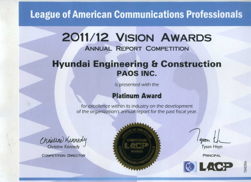현대건설이 세계적 마케팅 조사기관인 미국 LACP(League of American Communications Professionals)에서 진행한 ‘2011/12 연간 리포트(Annual Report) 평가’에서 비즈니스 서비스 부문 대상을 6회 연속 수상했다고 25일 밝혔다. 또 LACP가 발표한 ‘Top 100 Worldwide Winners’ 부문에서도 세계 26위를 차지, 글로벌 건설 리더로서의 위상을 확고히 했다.