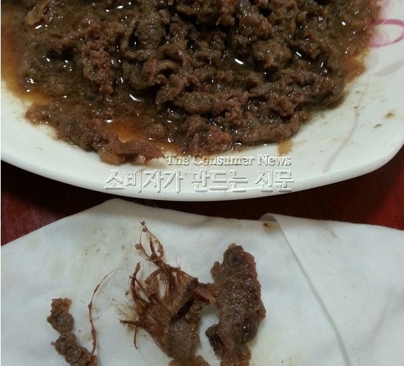 혹시 조리 중 자신의 머리카락이 들어간 게 아닌가 싶어 고기를 뒤적이던 남 씨는 경악을 금할 수 없었다. 5cm가량이 넘는 긴 갈색 털이 고기에 붙어나온 것.