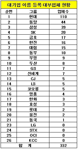 25일 재벌, 기업 경영평가 사이트인 CEO스코어데일리(대표 박주근)가 금융위원회 관할 시·도에 등록된 대부(중개)업체 조회서비스로 30대 그룹의 회사명을 조사했더니 26개 키워드로 332개 업체가 등록된 것으로 나타났다. 단어 중복 등을 감안하더라도 해당 대기업 이름을 사용한 업체가 족히 300곳이 넘는다.