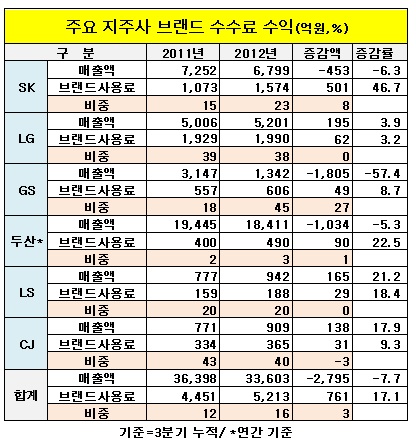 1년 사이 매출액에서 브랜드 사용료 비중이 가장 크게 늘어난 지주사는 GS였다. 2011년까지만 해도 매출액이 3천억 원이 넘었지만, 지난해에는 간신히 1천300억 원을 넘기면서 600억 원 안팎인 브랜드 사용료 비중이 18%에서 45%로 수직 상승했다.