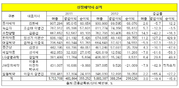 2011년 대비 성장세를 기록한 제약사는 한미약품(대표 임성기·이관순)과 LG생명과학(대표 정일재) 두 곳 뿐이다.