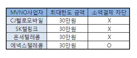 MVNO 소액결제 서비스 역시 결제 최대 한도 금액은 30만원으로 통신3사와 동일했다.