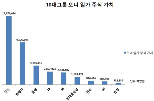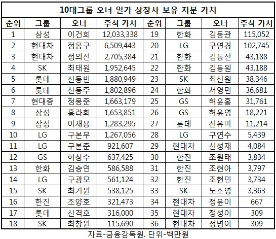 삼성 이건희 회장 일가는 14조9천700억 원으로 10대 그룹 오너 일가 중 주식 가치가 가장 높았고, 현대차그룹 정몽구 회장 일가는 9조2천200억 원으로 그 뒤를 이었다.
