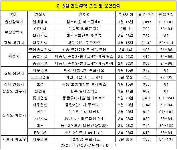 한편 수도권에서는 올해 실수요자들이 가장 관심을 갖고 있는 동탄2신도시 3차 합동분양이 오는 28일 견본주택 오픈과 함께 시작된다. 7개 가 총 6천207세대를 분양하는 동탄2신도시는 지난해 1~2차 동시분양이 성공적으로 끝난 바 있어 올해 수도권 분양시장의 척도가 될 전망이다.