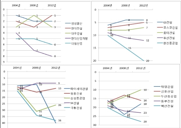 3년(2006~2008년) 간 1위를 차지했던 대우건설은 2011년 6위까지 미끄러졌으나, 차입금 상환 등 재무구조 개선으로 지난해에는 3위를 기록했다. 이 때문에 GS건설과 포스코건설, 대림산업이 한 단계씩 순위가 하락했으며, 대림산업은 2004년 이후 처음으로 5위 자리에서 물러났다.