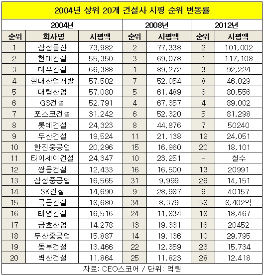28일 금융감독원과 CEO스코어(대표 박주근)에 따르면 2004년부터 지난해까지 시공능력평가 순위에서 현대건설과 삼성물산, 대우건설이 빅3를 형성한 가운데 9위까지는 큰 변화가 없었다. 반면 10위부터 20위까지는 SK건설과 두산중공업을 제외하곤 모조리 큰 폭으로 순위가 하락한 것으로 드러났다.