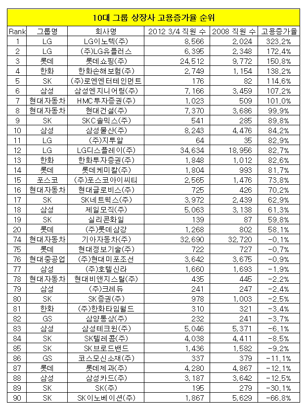 28일 재벌·CEO 경영성과 평가사이트인 CEO스코어(대표 박주근)에 따르면, 지난 2008년부터 작년 3분기까지 10대 그룹사 산하 91개 상장사 중 가장 높은 고용증가율을 기록한 것은 LG이노텍이었고, 2위는 LG유플러스, 3위는 롯데쇼핑이 차지했다.