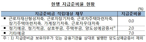 지급준비율은 소비자가 적립한 금액의 일정 부분을 적립해 금융회사가 융통하지 못하게 하는 제도다. 그래야 중도해지 등에 대비할 수 있기 때문이다. 현재 지급준비율은 시중은행 정기예금, 정기적금 등이 2%, 기타 예금은 7%다. 이렇게 묶여있는 돈이 많을 경우 이자수익을 내는 데는 그만큼 한계가 생길 수밖에 없다.