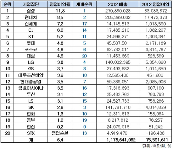 이 외에 롯데(회장 신격호) 4.8%, 포스코(회장 정준양) 4.6%, LG(회장 구본무) 3.8%, GS(회장 허창수) 3.7%, 대우조선해양(사장 고재호) 3.6%, 금호아시아나(회장 박삼구) 3.5%, 두산(회장 박용만) 3.1%, LS(회장 구자열) 3.1%, SK 2.8%, 동부(회장 김준기) 1.2% 등은 5% 미만의 영업이익률을 기록했다.