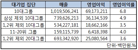 20대그룹 중 10대그룹만 살필 경우 매출 1천20조 영업이익 69조원으로 평균 6.8%의 영업이익률을 나타냈다.