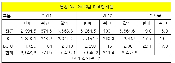 KT는 2011년에 비해 19.3% 증가한 2천600억원을 광고선전비로 투입했고 SK텔레콤은 4천억원을 지출해 6.9%의 증가율을 기록했다.