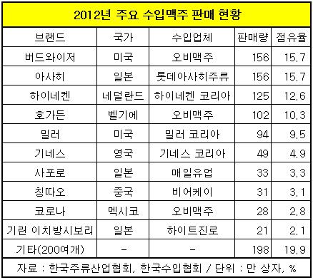 지난해 나란히 156만 상자를 팔아 15.7%로 나란히 최고 점유율을 기록한 버드와이저와 아사히의 경우 수입국이 최근 양적완화 정책으로 환율이 급락하고 있는 미국과 일본이며 5위 밀러(미국)와 7위 사포로(일본), 10위 기린 이치방시보리(일본)도 마찬가지다.