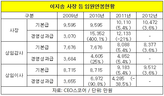 2009년 3천70만 원이었던 이 사장의 성과급은 그 이듬해 1억5천여 만원으로 거의 5배 수준으로 뛰었다. 받았다. 2011년에도 1억 2천여만 원에 달하는 성과급을 받았다.