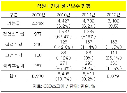 2009년에는 성과급이 기본급의 32%에 불과했으나, 2010년에는 160%, 2011년에도 120%로 비중이 역전됐다.