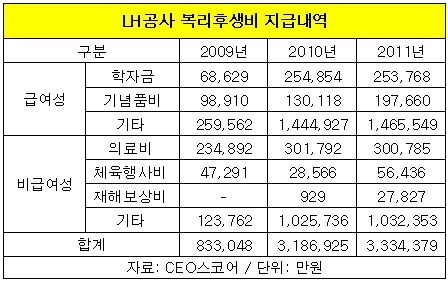 대표적으로 급여성 복리후생비 항목 중 학자금은 2009년 통합 당시 6억 8천만원에 불과했으나, 2010년에는 25억 4천여만원으로 3배 이상 늘었다. 기타 항목 역시 2009년 25억 9천만 원에서, 2010년에는 무려 144억 4천만 원으로 5배 가까이 증가했다.