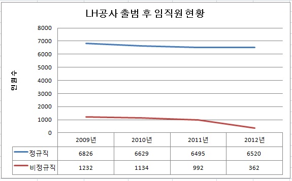 실제로 2009년 LH공사의 직원수는 정규직 6천826명과 비정규직 1천232명이었으나 지난해는 정규직이 6천520명, 비정규직이 362명이었다. 정규직은 불과 306명(4.5%) 줄어든 반면, 비정규직은 무려 870명(71%)이나 감소한 것이다.