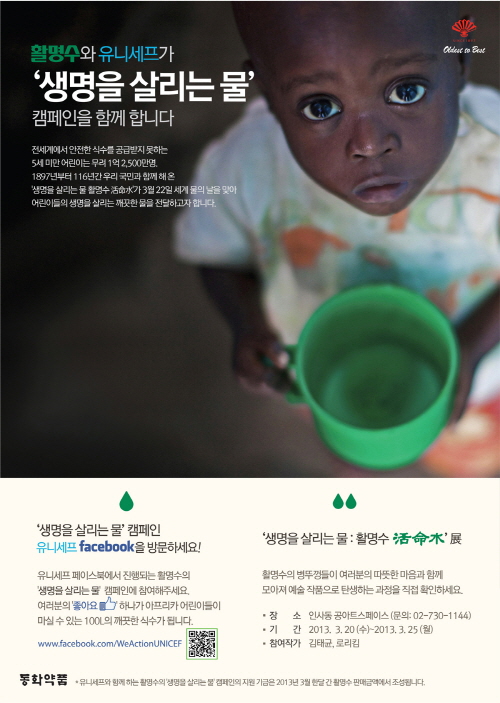 활명수와 유니세프가 함께 하는 이번 캠페인은 식수 부족과 물 정화 시설의 부족으로 생명을 위협받고 있는 전 세계 어린이들에게 깨끗한 물을 전달하는 사회공헌 활동이다. 지원 기금은 활명수 판매금액으로 조성하며 온라인 소비자 참여에 의해 기금을 전달한다.