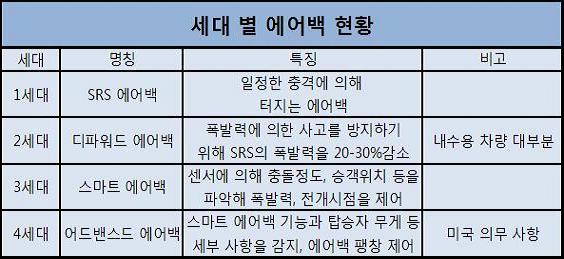 현재까지 출시된 에어백은 총 4세대로 구분하는데 현재 국내 차종에 장착된 대부분은 2세대에 해당되는 '디파워드 에어백'이다.