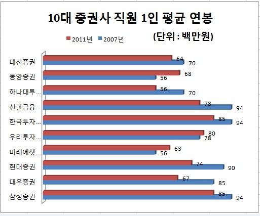 업계 1위인 삼성증권의 경우 2007년 평균 연봉이 9천400만 원으로 1억 원에 육박했으나 4년 새 8천만 원대 중반으로 떨어졌다. 삼성증권과 함께 한국투자증권(9천400만 원), 신한금융투자(9천400만 원), 현대증권(9천만 원) 등도 9천만 원대에서 최저 7천400만 원으로 하락했다.
