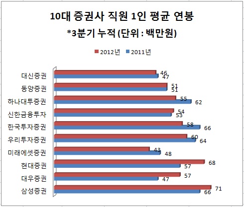 지난해 3분기 누적 기준으로 10대 증권사의 직원 평균 연봉은 5천630만 원으로, 전년 동기 5천610만 원과 비슷한 수준을 기록했다. 삼성증권(7.6%)과 대우증권(21.3%) 현대증권(19.3%)만 평균 연봉이 상승했고, 동양증권과 신한금융투자는 현상유지, 나머지 5개사는 감소했다.