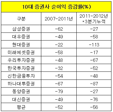 지난 2007년과 비교할 경우 10대 증권사 모두 2011년 순이익이 두자릿 수로 감소했고, 지난해에도 3분기 누적 기준 순이익이 전년 동기대비 큰 폭으로 감소하거나 일부는 적자경영으로 전환됐다.