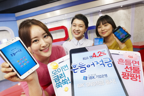 IBK기업은행(은행장 조준희)이 30명 이상이 모여 휴대폰을 흔드는 횟수와 강도에 따라 적립금이 달라지는 신개념 적금상품을 내놨다.