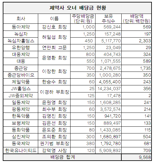 이밖에 삼진제약 조의환 회장이 5억400만원, JW중외제약 이경하 부회장이 3억5천800만원, 제일약품 한승수 회장이 2억4천300만 원, 일동제약 윤원영 회장이 2억4천100만원, 광동제약 최수부 회장이 2억1천400만원을 배당 받는다.